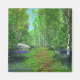 Ein überwucherter Weg, der an einem sonnigen Sommertag durch den Birkenwald schlängelt. Im Schatten der Bäume häufen sich Teppiche von Bluebells in Blautönen und lila im Kontrast zum Frühlingsgrün des Grases und Birken.