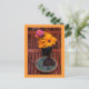 Auf dieser Postkarte finden Sie eine köstliche frisch gebackene Torte aus frisch gepflückten Heidelbeeren! Eine Vase aus rosa und orangefarbenen Zinen und goldfarbenen, schwarz-mit Augen Susans schmückt die Latten des Tischs, der noch von einem morgendlichen Regenschirm aus nass ist.