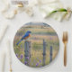 Ein Blauvogel steht auf einem überdachten Holzzaun mit Stacheldraht, umgeben von einem großen Gras und lila Wildblumen