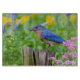 Bluebird-Männchen auf Zaunpfosten im Blumengarten Schneidebrett