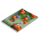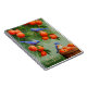 Zwei Western Bluebirds stehen in einem Pfirsichbaum, während ein dritter Bluebird auf einem Korb sitzt, der mit frisch geerntetem, marktreif geerntetem Obst gefüllt ist. Realistische Kunstwerke, die aus einer Ölmalerei des Künstlers Crista S. Forest entstanden sind.