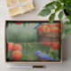 Zwei Western Bluebirds stehen in einem Pfirsichbaum, während ein dritter Bluebird auf einem Korb sitzt, der mit frisch geerntetem, marktreif geerntetem Obst gefüllt ist. Realistische Kunstwerke, die aus einer Ölmalerei des Künstlers Crista S. Forest entstanden sind.