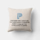 A detailed blueprint-style illustration of the letter P is presented against a vibrant blue background. The letter itself is rendered in white, with intricate details and precise measurements indicated by thin white lines. The back of the pillow includes a blue outline of the letter P set against a textured light beige background with a 4-line poem about the letter below.