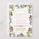 Diese elegante Blumen-Hochzeitseinladung mit goldfarbenem und rosa Text, umgeben von einer Fülle von Frühlingsblumen in Pastellfarben. Die strahlenden Blüten sind rosa Rosen, Lavendelhydrangea, weiße Orchideen und Calla Lilien. Ideal für eine Hochzeit im Frühling oder Sommer.