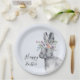 Hübsches graues Aquarellbunny mit Blumenkronenbild und anpassbarem Happy Oaster Text auf pastellblauem Hintergrund