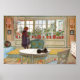 Kleines Mädchen gießt farbenfrohe Blume im Fenster. Detaillierte Quellfarbe von Carl Larsson.
