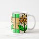 eine farbige Glasscheibe, die eine gelbe und weiße Farbe mit grünen Blätter zeigt.