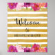 Plakatdruck für Begrüßungsschild mit Blume-Design und Imitaten goldenen Streifen Hintergrund.