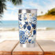 Blauer Blütenblumen auf weißem, isoliertem, rostfreiem Edelstahl-Tellerglas