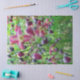 Epimedium ist eine blühende Pflanze, deren Blüten nach unten hängen. Sie ist bekannt unter vielen Namen wie Fairy Wings und Horny Goat Weed. Für dieses lebendige Farb-Makro-Foto steckte ich meine Kamera unter die Blüten und schoss nach oben. Zahlreiche blaue Knospen hängen im Rahmen. Mehrere Knospen, die gerade erst zu öffnen beginnen, erscheinen größer und heller, lila und magenta. In der oberen Mitte des Fotos befinden sich zwei vollständig offene Blüten: vier dunkelrosa Blütenblätter, die jeweils von weißen Blütenblättern gesäumt sind, die sich um die grünen Pistillen und die gelben Blüten in ihren Mitte schwenken. Die oberste Blume liegt in der flachen Feldtiefe, wobei die meisten verbleibenden Knospen, Blüten und grünen Gräser im Hintergrund weich verschwommen sind. Digitales, Farbfoto. Copyright © Claire E. Skinner. Alle Rechte vorbehalten.