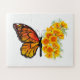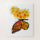 Orangefarbener, detaillierter Monarchen-Schmetterling mit einem Flügel mit gelbem, lebendigen kalifornischen Mohn auf weißem Hintergrund.