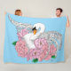 Ein weißer Schwan, umgeben von rosa Blume und einem blauen Hintergrund