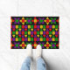 Diese Türmatte hat ein Schwarzes Geschichtsbild von Blume und Zeilen aus Dreiecken und Rechtecken.