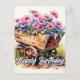 Auf dieser Postkarte des niedlichen Geburtstags befinden sich einige perky aster Blume in einem Holzwagen. Diese Postkarte wäre ideal für Freunde, Familie und Mitarbeiter.