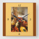 Entworfen mit einem Bild eines Herbstblumenarrangements. Diese Anordnung wurde in den Farben Orangen, Rot, Gelb und Braun angezeigt. Das Arrangement umfasst Blume, Kürbisse und getrocknete Blätter. Dieses Bild war ein nahes Bild, das die Herbstmonate zeigte. Eine braune Grenze wurde hinzugefügt. Diese Uhr ist in Quadrat oder Runde erhältlich.