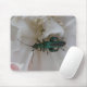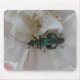 Dieses Mousepad zeigt ein Foto einer bläulich-grünen britischen Blume Käfer, die auf einer weißen Carnation-Blume sitzt. Das Foto wurde mit Makrofotografie aufgenommen, um die Details und die Farbe dieser wunderschönen Käfer-Art zu zeigen.