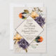 Herbstthemed stilvolle Hochzeitseinladung in einem Elfenbein-Imitate Wellpappe wie Textur getan. Ein lila, gerahmter, rautenförmiger Textbereich, mit lila und goldgelben Blumen mit Pampasgras und farbenfrohen Federn, die Ober und Unterseite zieren. Personalisieren Sie den gesamten Text für Ihren besonderen Tag. Matching Produkte sind erhältlich.