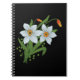 Schönes Bouquet mit bunten Frühlingsblumen, gelben Tulpen und weißen Narzissen auf schwarzem Hintergrund.