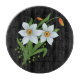 Schönes Bouquet mit bunten Frühlingsblumen, gelben Tulpen und weißen Narzissen auf schwarzem Hintergrund.