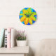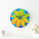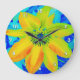Die florale Acrylwanduhr wird von einer farbenfrohen Blume aus gelb, orange und grün mit einem lebendigen Aquarelle und Blau geschmückt. Dieses Bild ist digital manipuliert Original Fotografie von JLW_FOTOGRAFIE.