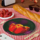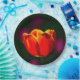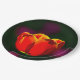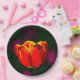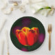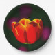 Rote Tulpe-Blume vor dunkelgrünem Hintergrund und rosa, verschwommene Flecken anderer Tulpe-Blume. Boul des Feuers, Kugel des Live-Sonnenlichts. Das Symbol des neuen Lebens. Shine, beleuchten, bestrahlen und inspirier!
