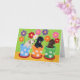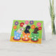 Blume Pot Labrador Welpen Card für Labrador Fans. Drei Welpen sitzen in den farbenfrohen Blume mit orangefarbenen, rosa und roten Blume. Schwarze Labrador, Gelbes Labrador, Schokolade Labrador Welpen sind alle auf dem Bild gemalt. Whimsical Labrador Malerei von Naomi Ochiai aus Japan gemalt.
