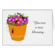 Ein blühender Blume-Topf, der mit Pflanze überfließt und auf ihm krabbelnde Ladybugs krabbeln. Fügen Sie Ihre eigene Nachricht zu anpassen.