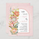 BUDGET Tropische Protea Blume Pampas Gras und Eukalyprus Blätter weiche rosa Bogen Hochzeit Einladung mit QR-Code. Dieses hübsche Hochzeitsdesign zeigt einen Bogenrahmen auf rot-rosa Farbhintergrund mit Ihren Initalien und Texten. Auf der links Seite befinden sich Protea-Blume, Pampas-Gras, ein Palmenblatt und Eukalyptus-Blätter. Die Rückseite enthält Ihren QR-Code für UAWG.