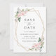 Mit dieser bezaubernden Save the Date Karte laden Sie Freunde und Familie in Stil und Set ein. Die Einrichtung besteht aus rot-rosa Blume, Grünpflanzen und goldfarbenem Rahmen auf weißem Hintergrund.