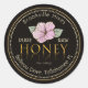 Schwarzes Etikett mit dem Wort HONEY geschrieben und in metallischem Gold auf schwarzem Hintergrund mit doppeltem Gold und gepunktetem Rand reflektiert. Wildblume. Vorkalkulierte Liste der Nettogewichtsumwandlungen von Honig. Der bearbeitbare Text lautet "rein, roh".