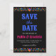 Feiern Sie Ihre Liebe mit dieser eleganten und festlichen Save the Date Karte! Dieses hübsche Blumendesign, das vom traditionellen mexikanischen Papelpicado inspiriert wurde, eignet sich perfekt für eine Hochzeit in Urlaubsort oder ein Fest. Der schwarze Hintergrund verleiht dem Ganzen ein elegantes und modernes Aussehen, während die lebhaften Farben und die aufwändigen Details eine Touch des traditionellen Charmes verleihen.