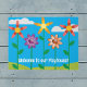 Große, farbenfrohe Blume gegen einen strahlend blauen Himmel in einem lustigen Kinderbilderstil für Kinderspielhäuser.
