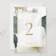 Schick und elegant. Diese wunderschöne Hochzeitsfeier-Tischnummer besticht durch einen hübschen Blumenstrauß in Aquarellfarben mit Goldakzenten. Das Design umfasst einen zeitgenössischen Schriftart in der Imitation von Set aus Gold in einem weichen weißen Overlay mit einem zarten Rahmen. Das Design wird hinten wiederholt.
