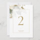 Schick und elegant. Diese wunderschöne Hochzeitsfeier-Tischnummer besticht durch einen hübschen Blumenstrauß in Aquarellfarben mit Goldakzenten. Das Design umfasst einen zeitgenössischen Schriftart in der Imitation von Set aus Gold in einem weichen weißen Overlay mit einem zarten Rahmen. Das Design wird hinten wiederholt.
