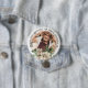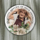 Ein zauberhafter Knopf für Freunde und Familie, um bei einer Beerdigung oder Gedenkfeier zu tragen, mit einem Foto Ihres Liebsten und den Worten "IN LOVING MEMORY OF", ihrem Namen und einem Aquarellbukett aus weißen Rosen und Eukalyptusgrün.