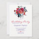 Blumenfeminine Geburtstagsgeschenk-Einladung mit einem wunderschönen Rose-Bouquet aus Rot, Bordeaux, Rosa Blüte, Magenta, Mitternachtsblau und violett lila bohemianische Blume, Federn und Blattwerk mit extravagantem zeitgenössischem, wechselndem Drehbuch. — Die Einladung ist ideal für böhmische rustikale Frühling oder Sommer florale Outdoor/Garten elegant jedes Alter Geburtstag Party.
