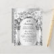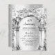 Ein großer Marmorbogen, der mit Blumen und Imitaten verziert ist. Personalisieren Sie Ihre Party-Daten und fügen Sie sie hinzu. Ein Imitat silber aussehender Hintergrund. 1 Blatt = 1 Einladung mit Druckkante bis Kante.