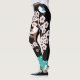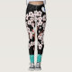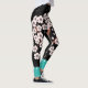 Der Blumengarten mit den Singvögeln auf diesen Leggings ist mit rosafarbenen Blüten und weißen Vögeln mit einem geschmolzenen Aquabürtel auf schwarzem Hintergrund ausgestattet.