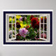 Ein lustiges Plakat, das aussieht, als würden Sie aus Ihrem Fenster in den Garten schauen, der mit bunten Dahlias gefüllt ist.