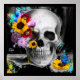 Original digitale Malerei und schwarzer Hintergrund. Realistischer menschlicher Schädel in grauem Maßstab, farbenfrohe wilde Blume und Schmetterlinge, die aus der Augenhöhle wachsen. Aquarellfarbe Spritzer. Gelbe Sonnenblumen, rosa und lila Gänseblumen und rote Mohnblumen. Modernes Design des Zuckerschädels. Ideal zu Halloween oder für diejenigen, die einen Hauch von Gotik Liebe.