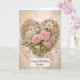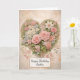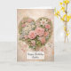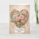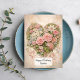Eine zarte, vintage-inspirierte Illustration einer herzförmigen Anordnung, gefüllt mit sanften rosa Rosen und pastellfarbenen Blumen. Die Komposition ist vor einem hellen, texturierten Hintergrund mit subtilen Blumenmustern gesetzt, wodurch ein romantisches und zeitloses Design entsteht, das von der klassischen Shabby-Chic-Ästhetik inspiriert ist.