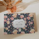 Laden Sie Ihre Hochzeitsgäste ein, ihre Wünsche und ihre Weisheit mit diesem gemusterten Gästebuch zu teilen. Elegantes Design mit einem zentrierten Element, das Ihre Namen und Ihr Hochzeitstermin trägt, mit zusätzlichem Text auf der Wirbelsäule. Ein Hintergrund mit Aquarellfarben-Rose, Peonies und Hydrangea in Rosa, Pfirsich und Creme, die einen eleganten und eleganten Look in einer dunkelblauen Kulisse verleihen.