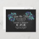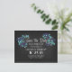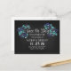 Rustikales und modernes Chalkboard Save the Date Postkarten mit blauen Blumenbouquets, Gänseblümchen, Wildblumen und trendigem Kalligraphie-Skript-Schriftart-Design.