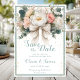 Charmante Save the Date-Karte mit Aquarellfarben-Blume, einem weichen Pastellbogen und zarten Goldkonfetti-Akzenten. Ein romantisches und zeitloses Design, um Ihre besondere Hochzeitsnacht mit Eleganz zu teilen.