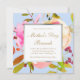 Wunderschönes Blumenstrauß mit Grünpflanzen, Beeren und Imitaten, goldener Rahmen auf der Vorderseite der Karte, blauer Hintergrund mit weißem Polka Dotmuster auf der Rückseite dieser trendigen und eleganten Mutter-Day Brunch Einladung.