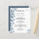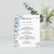Eine elegante und trendige Hochzeitskarte. Blauer botanischer Blumenkohl, Blätter und Sprigs in Aquarell. Personalisieren und fügen Sie Ihre Namen, Datum und das Hochzeitsmenü. Ein schick weißer Hintergrund. Schwarze Buchstaben. Das Wort Menu wird mit einem modernen Handschrift-Stil-Skript mit Swashes geschrieben. Zurück: blauer grauer Hintergrund.