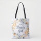 Maßgeschneiderte Brautparty Taschen personalisiert mit dem Namen Ihrer Blume Mädchen oder anderen benutzerdefinierten Text. Dieses elegante feminine Design hat einen Blumenkranz in Aquarelltönen mit staubigen Blüten in blau-grau und pachelgelb. Verwenden Sie die Designtools, um jedes Monogramm individuell zu gestalten, eine beliebige Hintergrundfarbe zu wählen, Schriftart und Farben zu bearbeiten und Fotos hinzuzufügen, um eine Art Tasche für Ihre Hochzeitsfeiergeschenke zu erstellen.