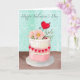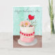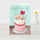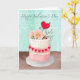 Leere Valentinsgrußkarte mit einer handgezeichneten Illustration eines rosa Kuchens mit Blumen und Herzen auf einem Teal- und Brauntönen.