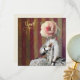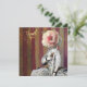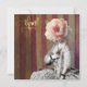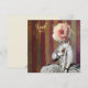 Vintager Kunstremix einer Frau mit einer peronischen Blume-Maske, die ihr Gesicht auf dem Kartendeckel bedeckt. Auf der Rückseite der Karte zeigt die Frau, die ihr Gesicht entdeckt, und dabei die Pony Maske in der Hand hält.