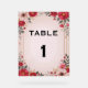 Rote, rosa und weiße Blume umgeben einen goldenen Doppelrahmen auf einem Muschel-Rosa Hintergrund, um ein schönes Hochzeitstischzeichen zu schaffen. Sehr elegant und perfekt für eine formelle Hochzeit.